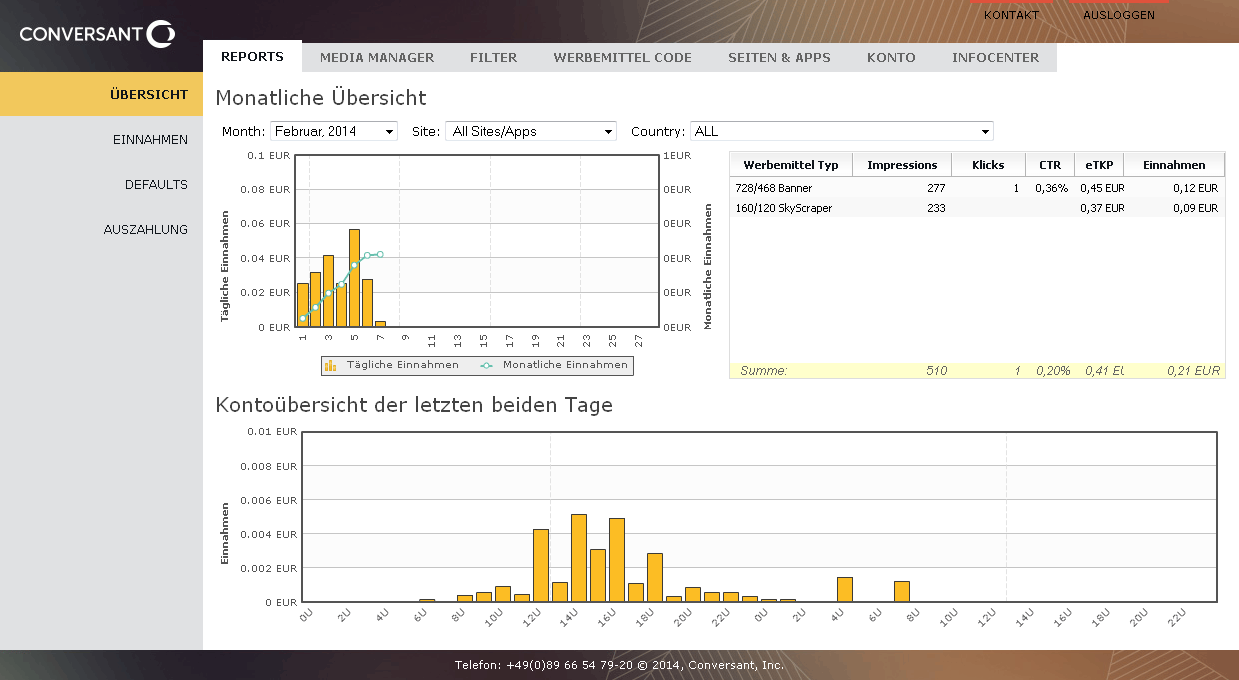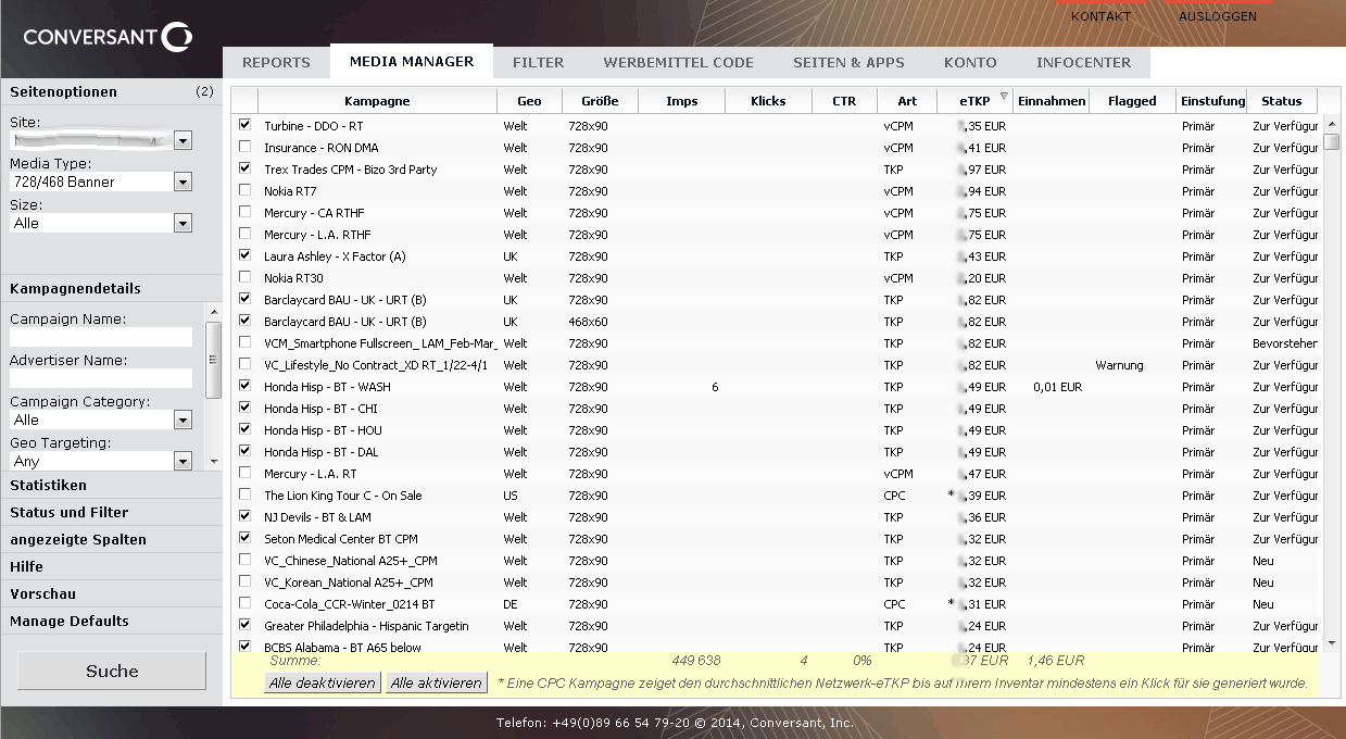 Details über das zu Conversant gehörende Affiliate-Netzwerk gibt es in einem eigenständigen Testbericht zu Commission Junction. Der folgende Text bezieht sich auf die Display-Marketing-Sparte von Conversant (bis zum Jahr 2014 unter dem Namen "ValueClick Media" bekannt): Da es sich bei Conversant um einen Premium-Vermarkter handelt, gibt es im Gegensatz zu anderen Vermarktern bestimmte Aufnahmekriterien. Man wird also nicht automatisch mit jeder Webseite als Publisher aufgenommen, sondern es kann durchaus passieren, dass man abgelehnt wird. Wenn man sich bewirbt, muss die entsprechende Webseite mindestens 100 Seitenaufrufe pro Tag haben. Bei Conversant gibt es für angelegte Werbeflächen keine festen TKPs, sondern der eTKP hängt immer davon ab, wie viele Kampagnen gerade laufen. Eine 100%ige Auslastung ist hierbei nicht garantiert, allerdings kann bei hochpreisigen Premium-Kampagnen auch mal ein erheblich höherer TKP möglich sein als bei allen anderen Vermarktern. Bei der Kampagnenverwaltung bei Conversant bleiben kaum Wünsche offnen. Man kann jede einzelne Kampagne manuell ablehnen und global einstellen, ob neue Kampagnen standardmäßig sofort aktiv sein sollen, oder ob man sie manuell freischalten können möchte. Auch ein Ausschluss von Kampagnen nach Kategorien ist problemlos möglich (bspw. Casino-, Tabak- und Alkohol-Kampagnen). Hier ein Blick auf die Kampagnenverwaltung in einem Publisher-Account (eTKPs wurden unkenntlich gemacht): Obwohl es bei Conversant meistens keine 100%ige Auslastung gibt, muss man sich keine Einnahmen entgehen lassen. Denn man kann hier sogenannte Default-Kampagnen einrichten, die immer dann eingeblendet werden, wenn Conversant keine eigenen Kampagnen liefern kann. Für diese Defaultkampagnen kann man einen eigenen Mindest-TKP angeben, so dass sichergestellt ist, dass die Einnahmen bei Conversant immer eine bestimmte Höhe haben, und ansonsten über die Defaultkampagne ein alternativer Werbeanbieter eingeblendet wird. Hier noch ein Blick auf die Publisher-Startseite, auf der man alle wichtigen Infos auf einen Blick präsentiert bekommt: Die grafischen Einnahmestatistiken und Auslastungsstatistiken kann man sich bei Bedarf noch viel detaillierter anschauen. Conversant eignet sich besonders gut für Webseiten, die neben dem deutschen Traffic auch viel internationalen Traffic haben, denn es sind stets auch zahlreiche Kampagnen für eher "exotische" Länder aus Asien und Afrika aktiv, die andere Vermarkter evtl. nicht so gut abdecken können. Die Auszahlung der Werbeeinnahmen erfolgt einmal monatlich per Banküberweisung ab einem Betrag von 25€. Das Geld wird jeweils ca. 15 Tage nach dem Ende eines Abrechnungsmonats überwiesen. In unseren Tests erfolgen die Auszahlungen immer sehr zuverlässig. Zu bemängeln ist nur, dass die AGB einen Abschnitt enthalten, in dem den Publishern eine Vertragsstrafe in Höhe von 5000€ angedroht wird, wenn sie gegen die AGB verstoßen.