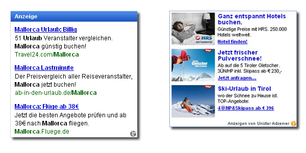 Ende 2011 hat sich Unister Media auch für externe Publisher geöffnet und bietet über ein Produkt namens Unister Adserver auch externen Webseitenbetreibern die Möglichkeit, über kontextbezogene textbasierte Anzeigen auf CPC-Basis Geld zu verdienen. Speziell für den Reisebereich gibt es noch ein weiteres Produkt namens Unister TouristikAdserver, bei dem nur Anzeigen eingeblendet, die zu diesem Themengebiet passen. Werbeformen beim Unister Adserver: Die eigenentwickelte Plattform Unister Adserver bietet neben reinen Textanzeigen auch Bild/Text-Kombinationen. Die Anzeigen werden über einen auktionsbasierten Echtzeitmarktplatz und Keyword-Targeting kontextsensitiv auf den vermarkteten Webseiten eingeblendet. Die Anzeigen können vom Publisher hinsichtlich Layout und Größe flexibel angepasst werden, fast alle denkbaren Sonderformate und Standardformate sind damit möglich. Hier ein Beispiel der textbasierten Werbeformen (zum Vergrößern bitte anklicken): Ebenfalls möglich sind Werbeplatzierungen wie Anzeigen in Popundern oder rotierende Anzeigen in Newslettern. Vergütung und Auszahlung: Die Einnahmen über die textbasierten Werbemittel des Unister Adservers werden klickbasiert auf CPC-Basis vergütet. Nur die PopUnder-Werbung wird per TKP vergütet. Die Publisher haben die Möglichkeit, über einen "Mindest-CPC" anzugeben, wie viel Geld sie mindestens pro Klick verdienen möchten. Allerdings sagt dies überhaupt nichts über die Höhe Einnahmen aus, da diese bei einer Klickrate von 0% exakt 0€ betragen würden. Eine bei zahlreichen anderen Online-Vermarktern übliche Angabe eines Mindest-TKPs bzw. Mindest-eTKPs ist bei Unister nicht möglich. Es ist aber nicht zu erwarten, dass die Klickrate sehr gering ist, da die Anzeigen durch die Übergabe von Keywords gut an die Themengebiete einer Webseite angepasst werden können. Die Auszahlung der Werbeeinnahmen erfolgt jeweils ca. 10 Tage nach Monatsende, wenn das Werbeguthaben den Wert von 100€ überschritten hat. Ansonsten werden die Einnahmen automatisch auf den nächsten Monat übertragen.