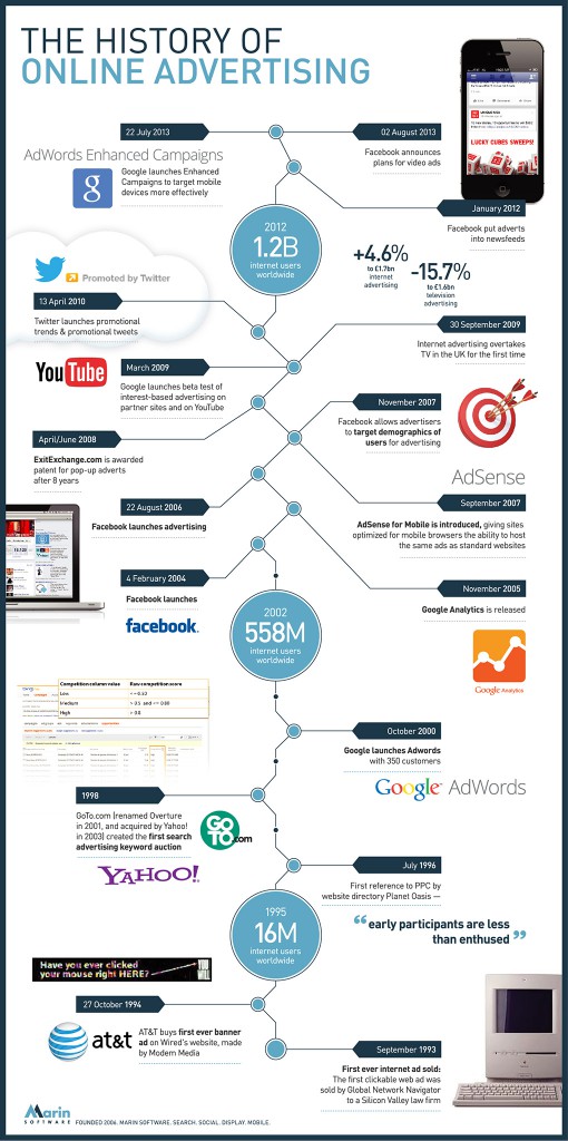 Vor 20 Jahren, im September 1993, wurde die erste Online-Anzeige verkauft. Anlässlich dieses Jubiläums hat Marin Software, ein Anbieter von Online-Marketing-Management-Lösungen, eine Infografik erstellt, die einige besonders wichtige Schritte in der Geschichte der digitalen Werbung zusammenfasst. Es begann mit einer einzigen Person, die jeden Anzeigenplatz im direkten Kontakt mit Kunden vermarktete. Heute sind weltweit hunderttausende Marketingexperten mit Online-Werbung befasst und der Einkauf von Milliarden Anzeigen auf Google, Facebook und Co. wird immer stärker automatisiert - mit auf Algorithmen basierender Software.