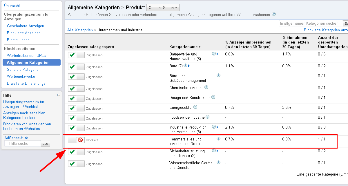 Das hilft uns zum Beispiel auch bei VermarkterCheck.de sehr, wo wir auch AdSense-Anzeigen nutzen. Bisher hatten wir immer das Problem, dass Google das Wort "Banner", das auf fast jeder Unterseite bei uns auftaucht, so interpretiert hat, dass sich die Besucher auch für Werbeschilder, Poster, Fahnen und Flaggen interessieren könnten. Durch das neuen AdSense-Überprüfungszentrum für Anzeigen können wir nun gezielt die sehr spezielle Unterkategorie "Unternehmen und Industrie -> Kommerzielles und industrielles Drucken" blockieren und somit einen Großteil der aus der o.g. Wort-Doppeldeutigkeit resultierenden unpassenden Anzeigen auf einen Schlag blockieren.