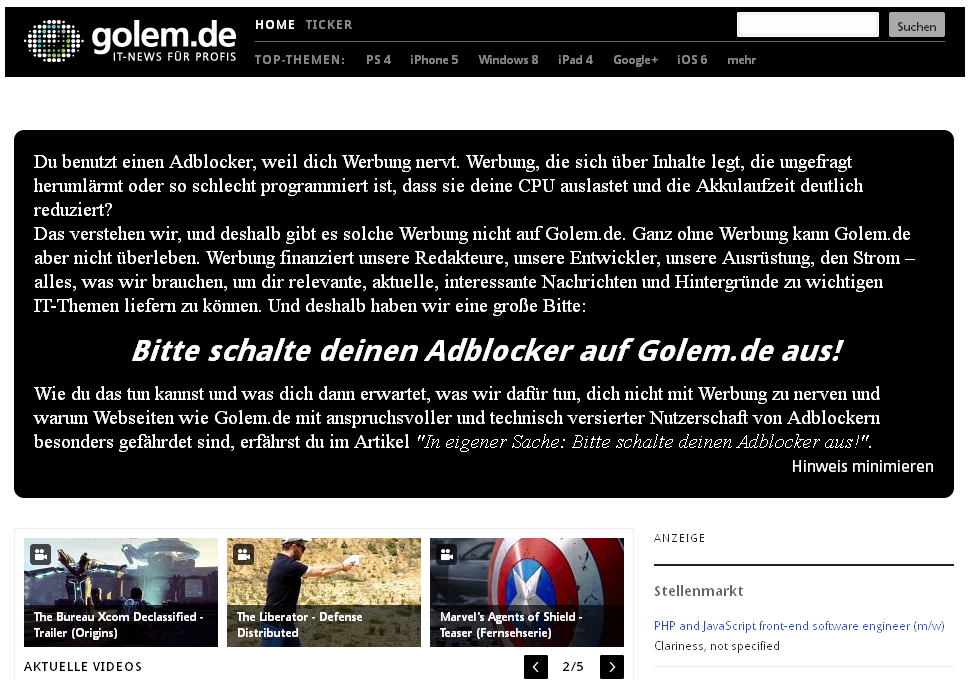 Auf Golem.de werden Adblock-Nutzer mit folgendem Hinweis begrüßt (siehe auch Screenshot rechts):