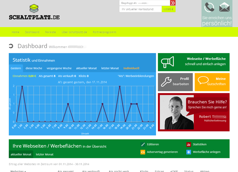 Das Dashboard der neuen Schaltplatz-Plattform soll Publishern die Möglichkeit einer besseren Kontrolle und Usability bieten. So gibt es nun zum Beispiel grafische Auswertungen der Werbeeinnahmen, so dass man viel schneller Trends erkennen kann als bisher. Die Statistiken zeigen den Verlauf der Ad-Impressions und die Einnahmekurve des Vortages, der aktuellen und vergangenen Woche und des aktuellen und letzten Monats. Zusätzlich kann man sich eine individualisierte Statistik ausgeben lassen.