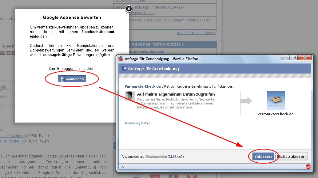 Schritt 2: VermarkterCheck den Zugriff auf das eigene Facebook-Konto erlauben: