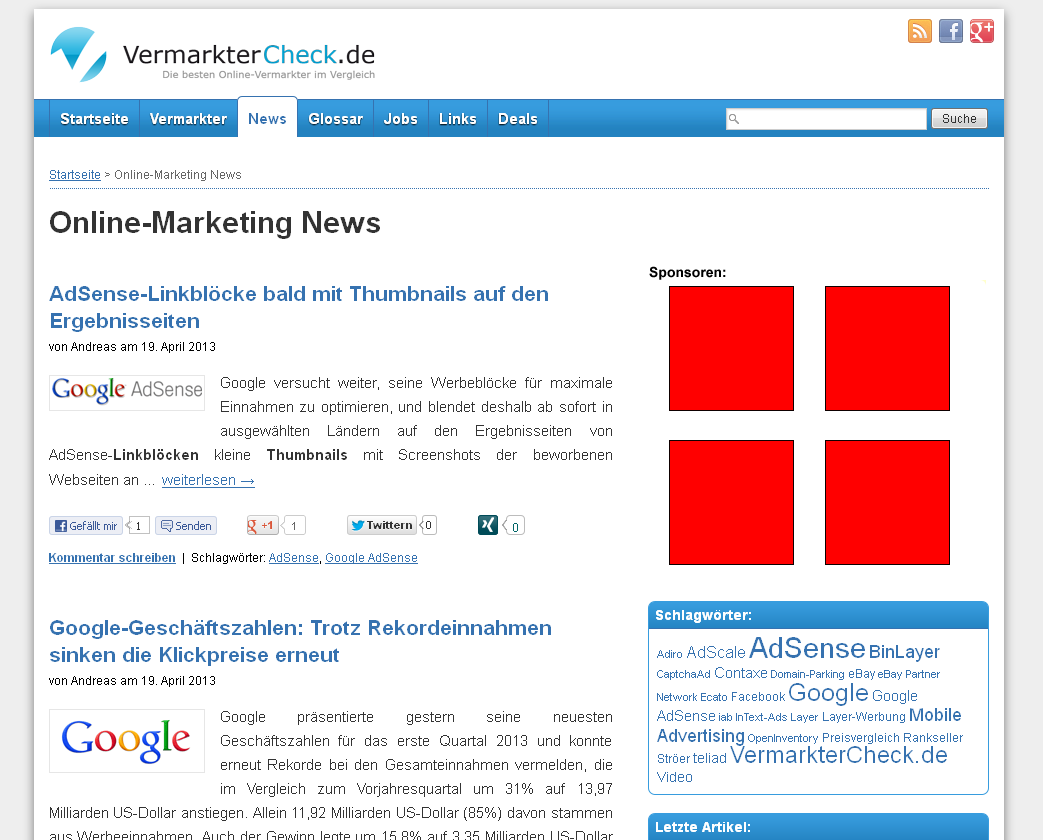 Jeden Monat wird VermarkterCheck.de von ca. 7.200 unterschiedlichen Besuchern (Unique User) aufgerufen, insgesamt gibt es monatlich ca. 23.000 Seitenaufrufe laut Google Analytics (für weitere Details siehe ausführliche Statistik ganz unten auf dieser Seite). Unsere Webseite gehört zu den Top-Suchergebnissen in Google bei Suchbegriffen wie "Vermarkter" oder "Banner-Vermarkter".Ihre Werbung auf VermarkterCheck.de: